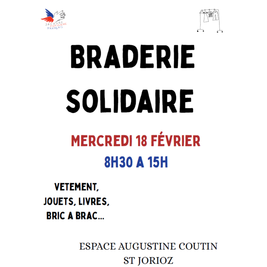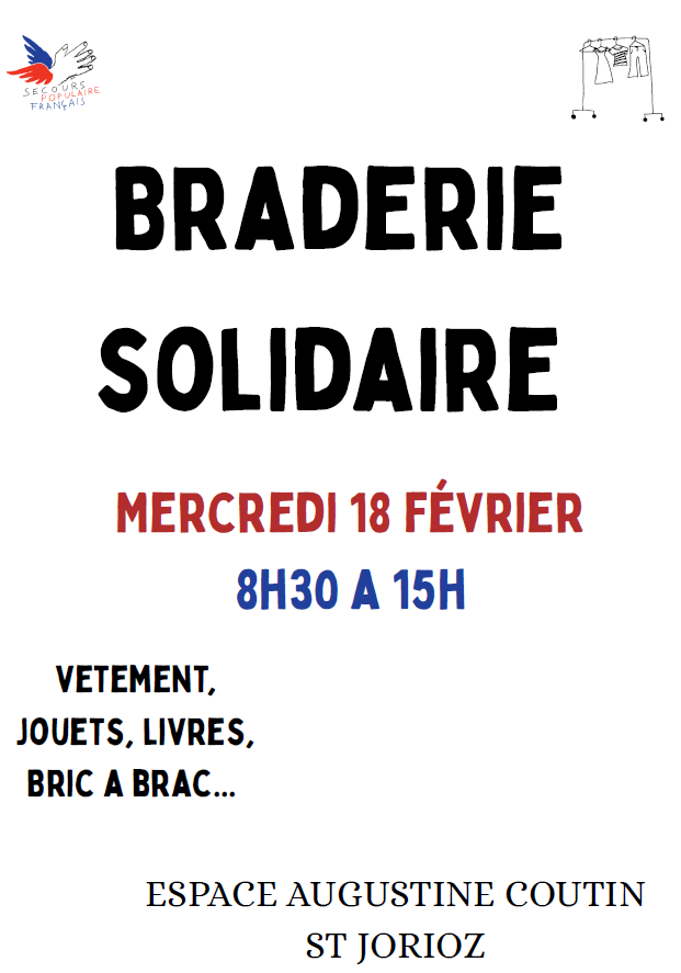 Le Secours Populaire Français organise une braderie le mercredi 18 février 2026 de 8h30 à 15h à l'Espace Augustine Coutin.