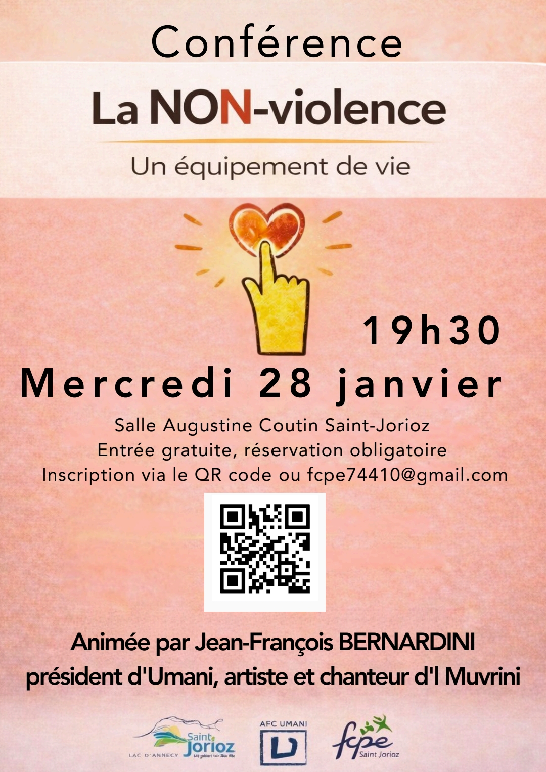 La FCPE organise une conférence sur le thème de la communication non violente « La Non-violence, un équipement de vie » le mercredi 28 janvier 2026 à 19h30 à l'Espace Augustine Coutin.