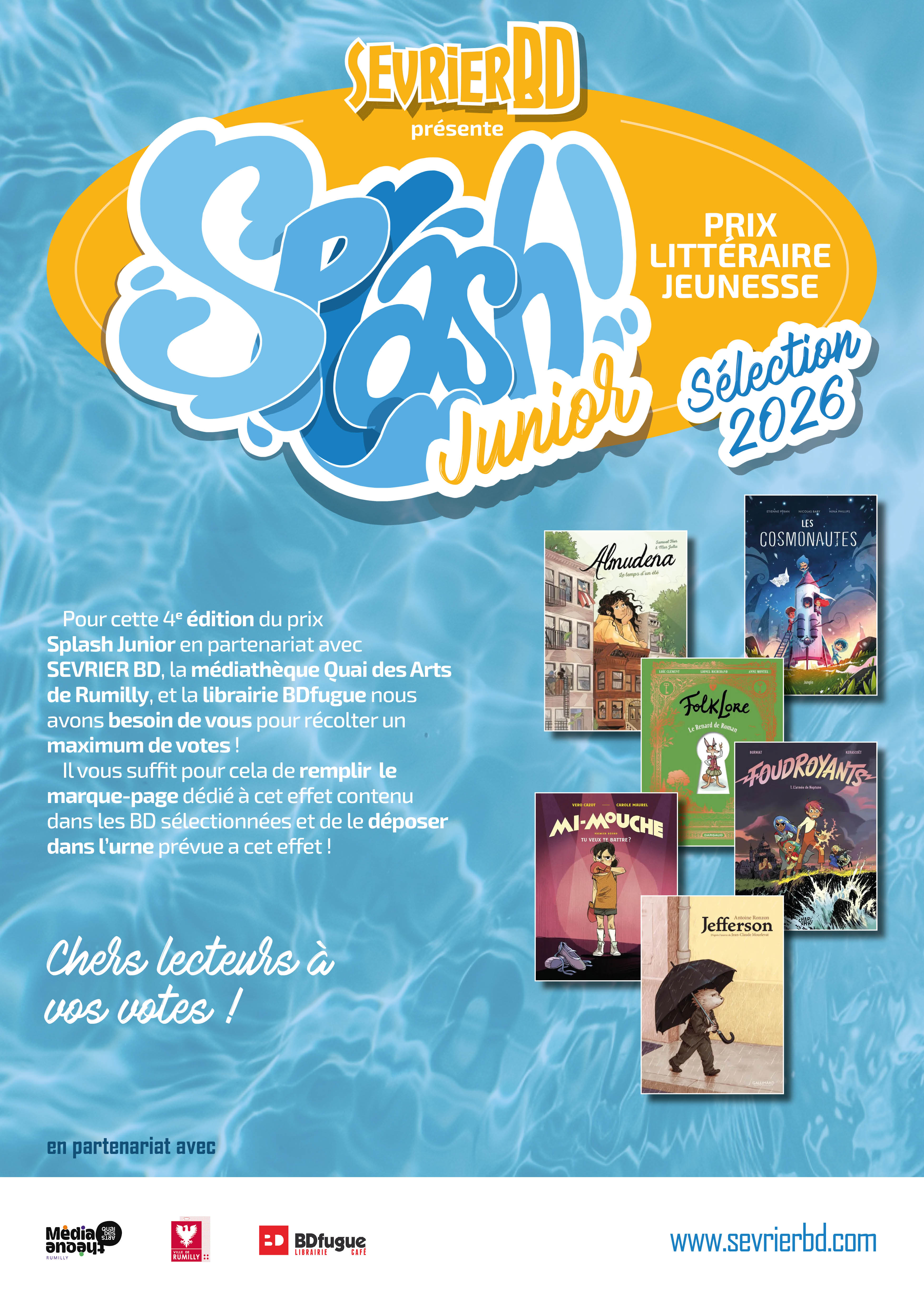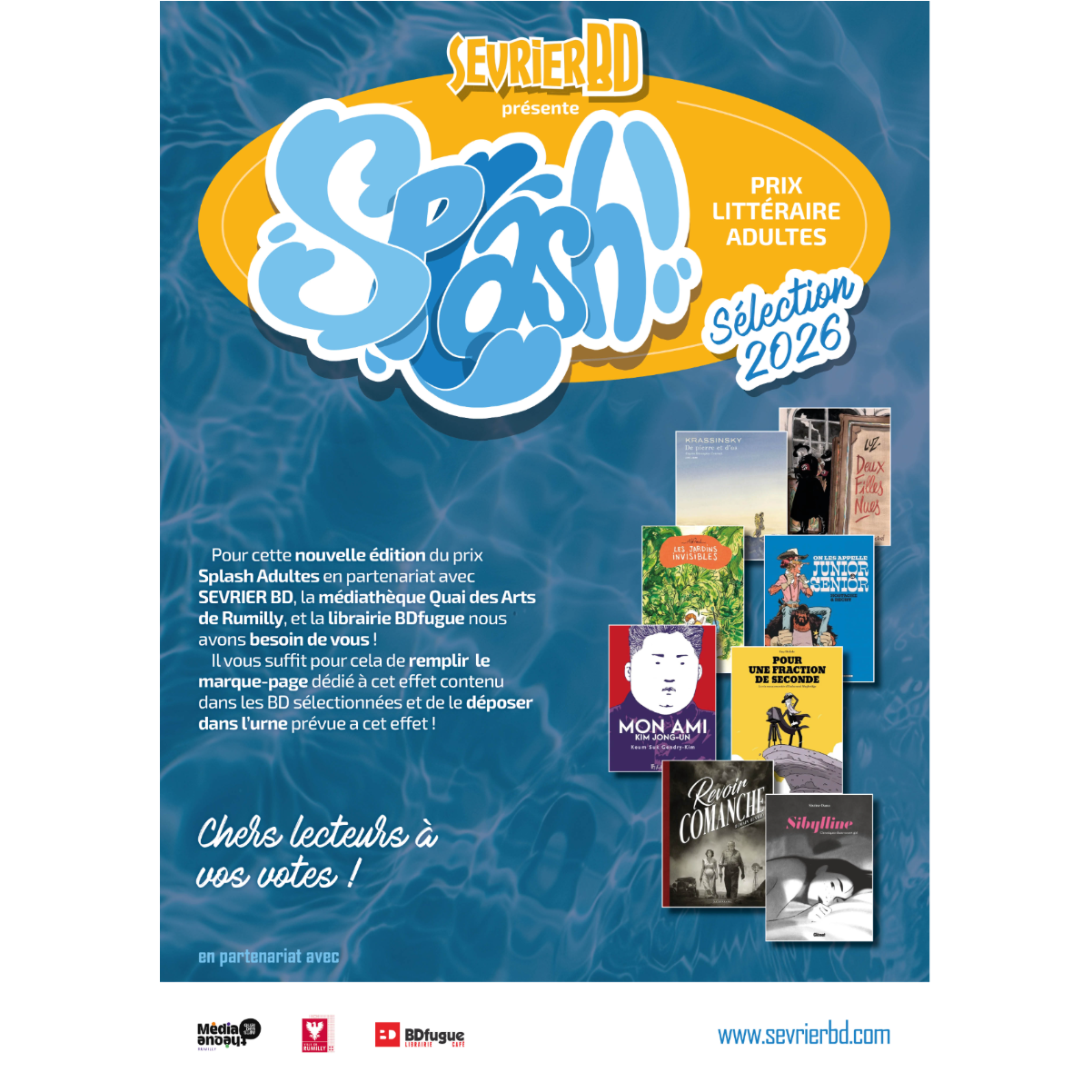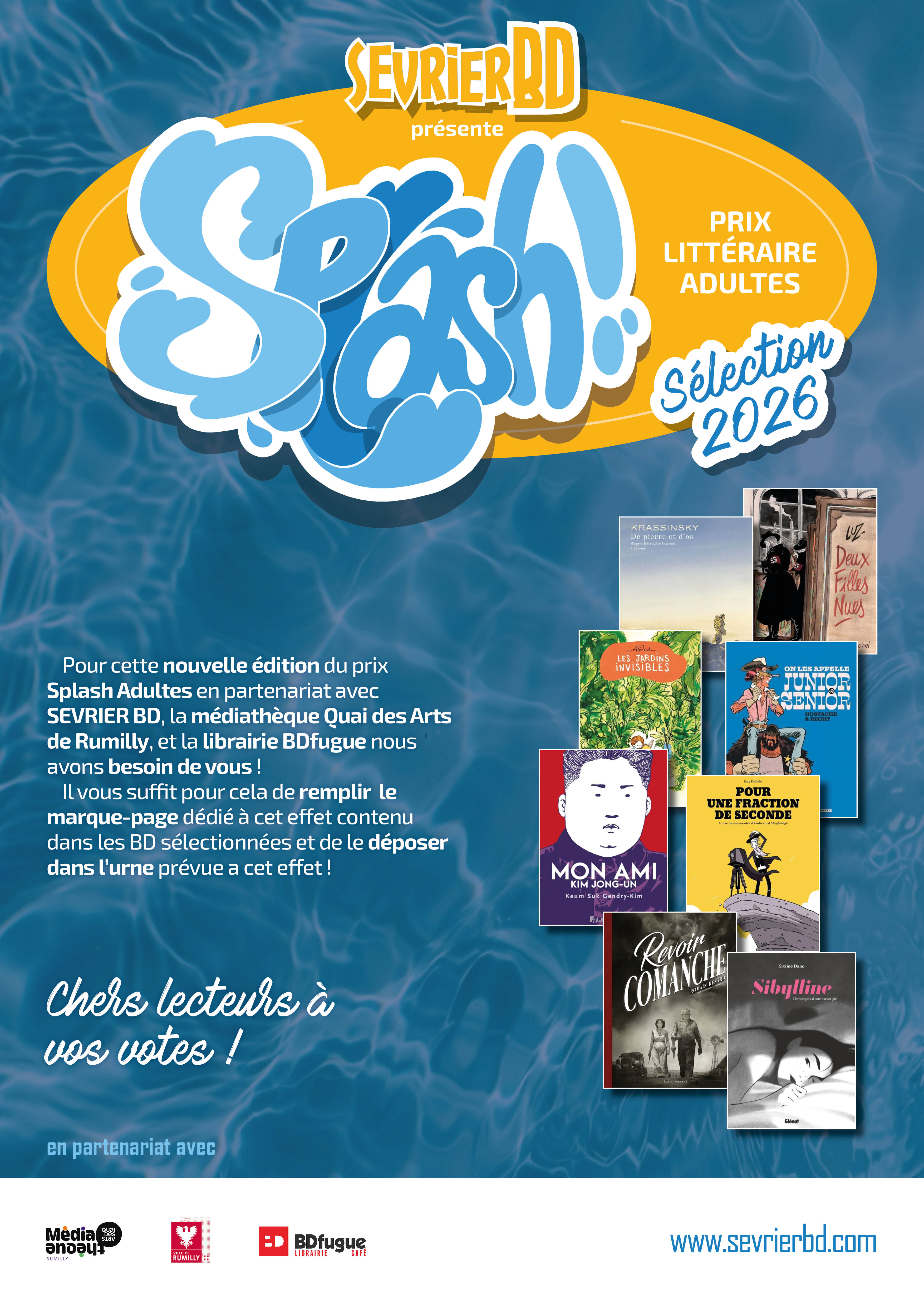 Dans le cadre du Festival de bande dessinée Sevrier BD, la Bibliothèque municipale de Saint-Jorioz participe au prix littéraire «Splash!» : un concours pour élire votre BD préférée parmi une sélection récente réalisée par un jury de libraires et bibliothécaires passionnés.