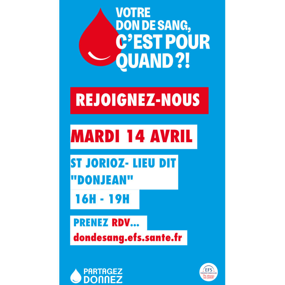 La prochaine collecte de sang organisée par l'Établissement Français du Sang aura lieu le mardi 14 avril 2026 de 16h à 19h à l'Espace Augustine Coutin.