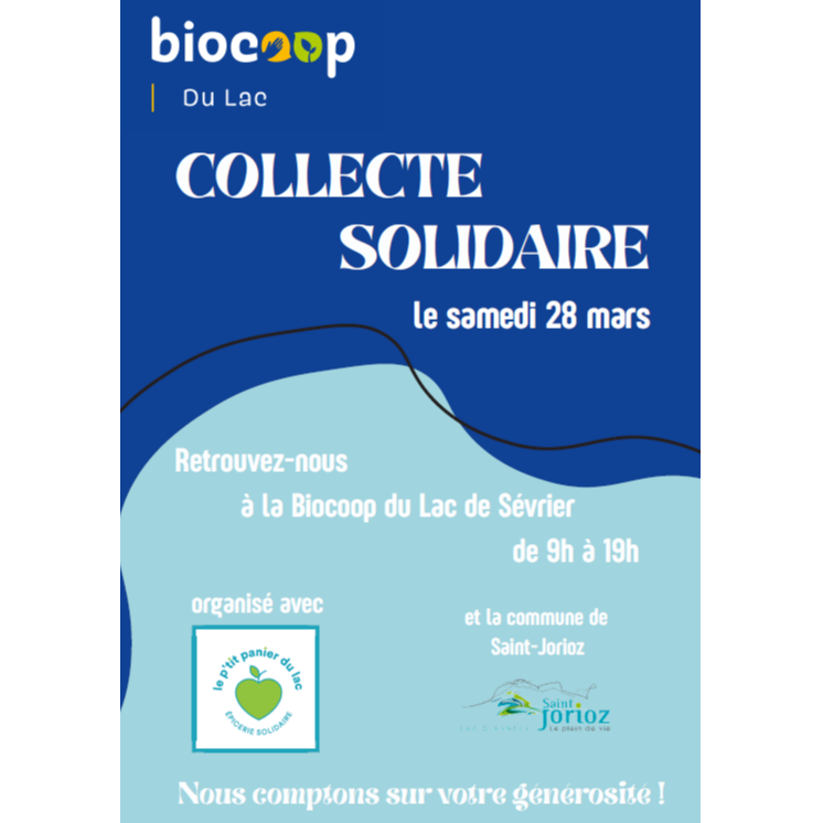 Les bénévoles de l'épicerie solidaire de la commune « Le P’tit panier du Lac » assureront une collecte solidaire au magasin Biocoop du Lac de Sevrier (4 550 Route d'Albertville) le samedi 28 mars 2026 de 9h à 19h.