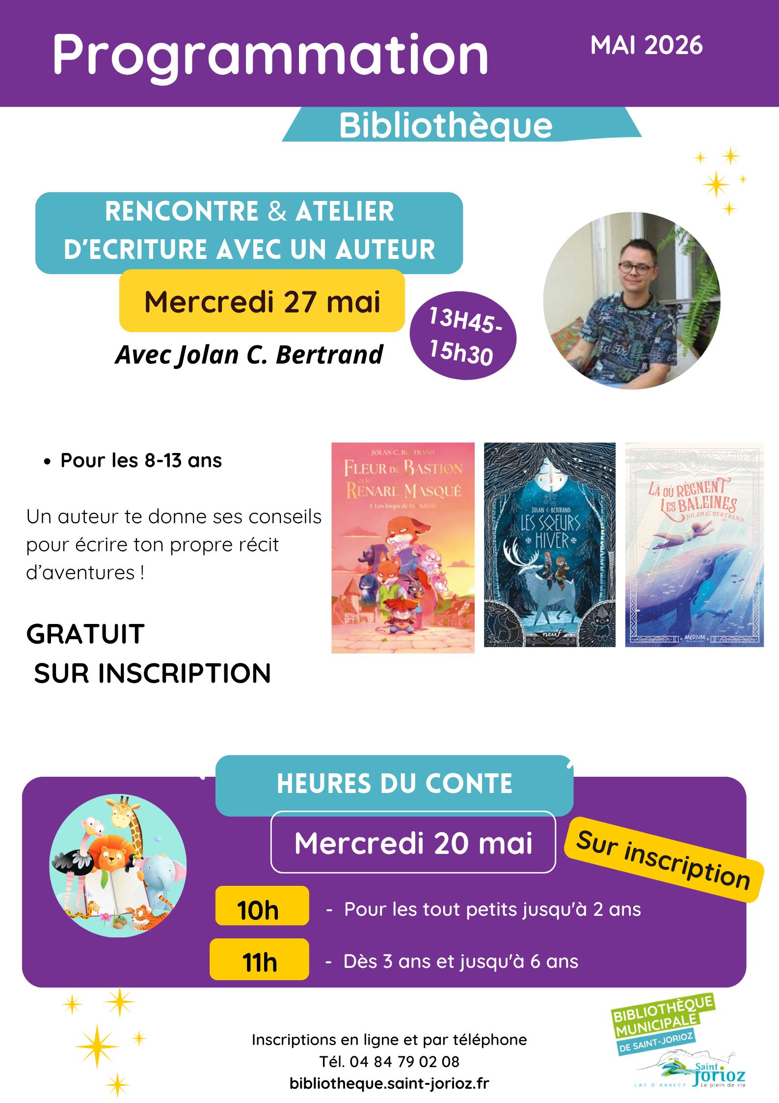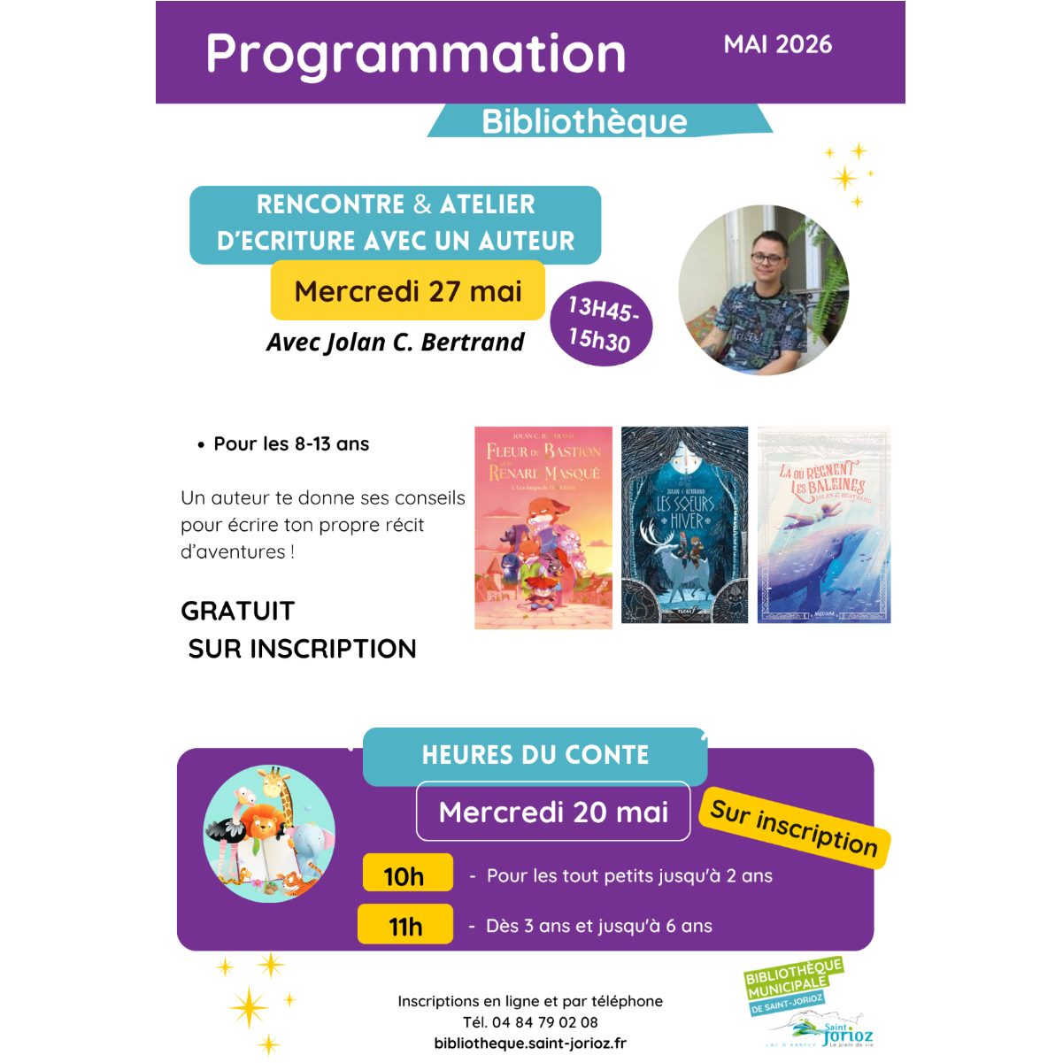 La Bibliothèque municipale de Saint-Jorioz organise une rencontre et un atelier d’écriture avec l’auteur jeunesse Jolan C. BERTRAND le mercredi 27 mai 2026 de 13h45 à 15h30 dans ses locaux.