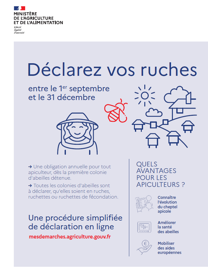 Chaque année, tout propriétaire ou détenteur de colonies d'abeilles (dès la 1re ruche) a l'obligation de procéder à une déclaration de détention et d'emplacement de ruches entre le 1er septembre et le 31 décembre.